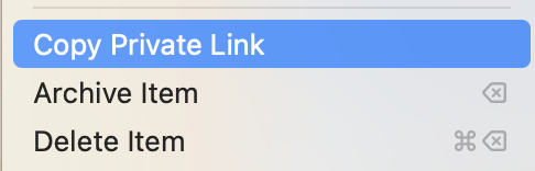 For any 1Password item, you select the Copy private link option from the More options (3 vertical dots) menu in the upper right corner of that Item.