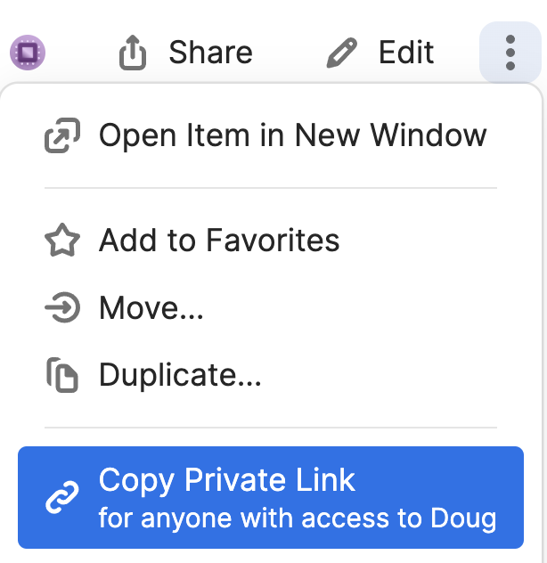 This private link is only available to anyone with access to its vault, which might be private (just me), personal (but accessible by other members), shared (spouse and me), or shared (all).