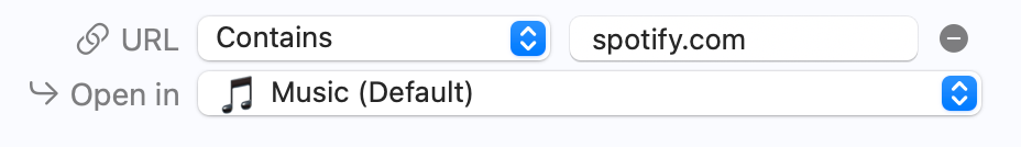 For example, you might have all URLs from spotify.com` to open in a `Music` space. Or you might separate links between Personal and Work spaces.