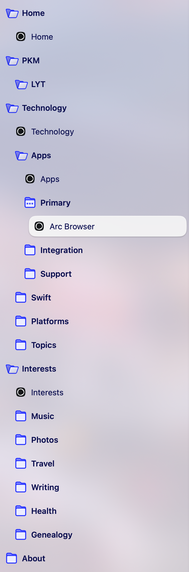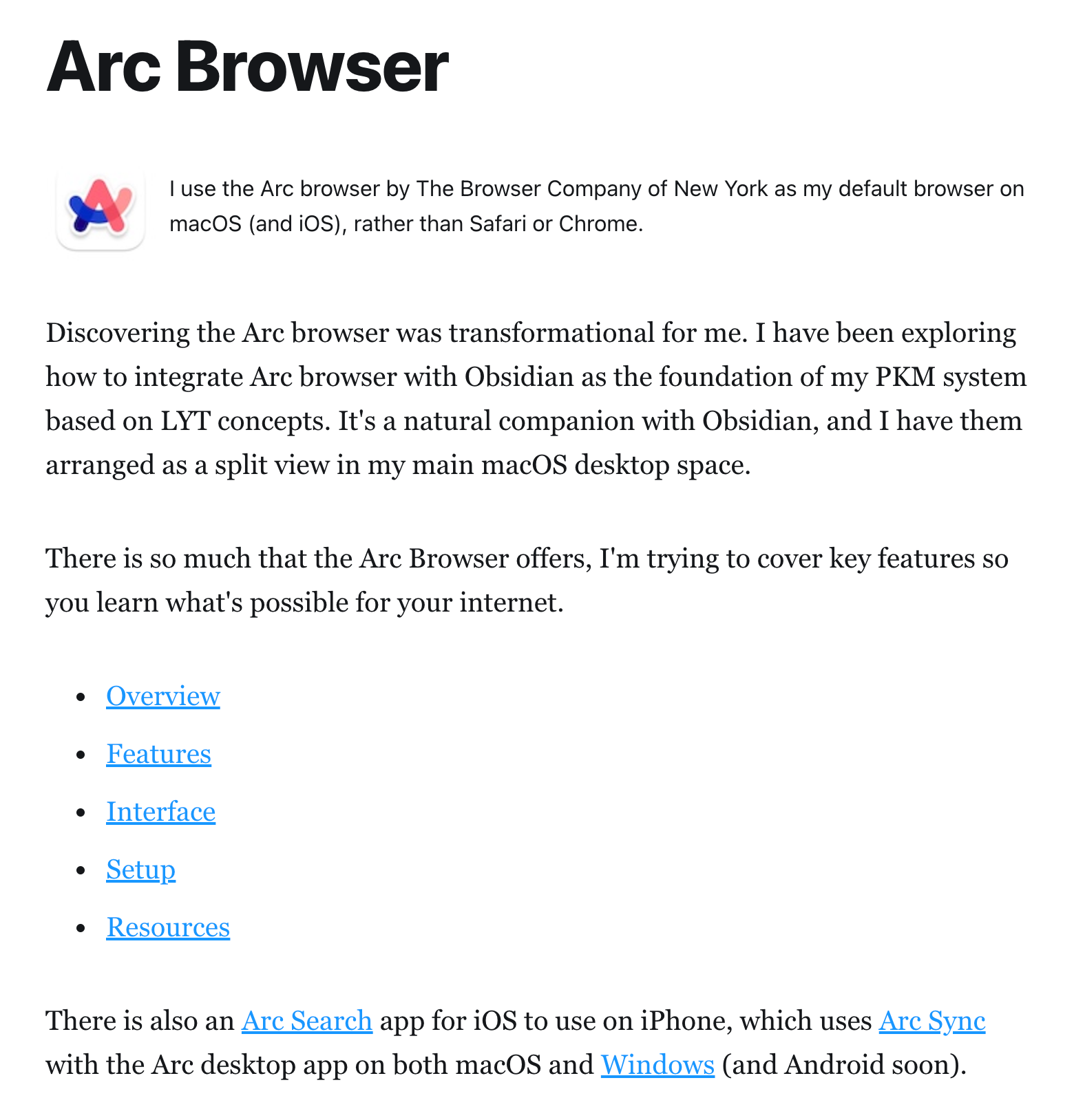 Here's my Arc Browser page on my Ghost website for WarrenWeb. Initially, I had several major sections for overview, features, interface, settings, and resources as a way to help organize the content and provide overall navigation within the topic. However, after doing Obsidian mapping, I'm getting a better understanding of what I have and might adjust how it's presented after some more thinking.
