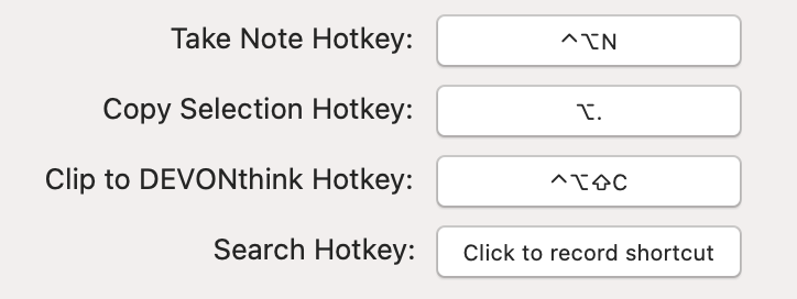 For DEVONthink, you can change hotkeys under the Sorter tab of Settings.