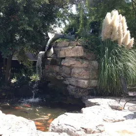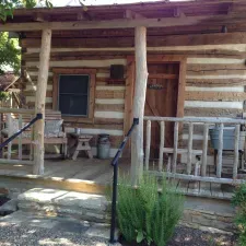 Across the highway is the old Cotton Gin Village, which is a quaint bed and breakfast with 19th century log cabins of various sizes such as the Rio Grande room shown below, which is fairly close to the entrance near the waterfall and fish pond. There are also modern cottages, and you can eat dinner at the award-winning upscale Cabernet Grill which features Texas cuisine and Texas wine.