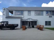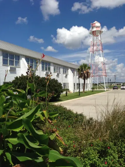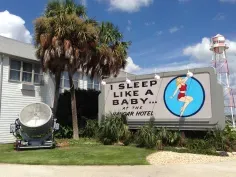 The Officer’s Club is the hotel bar and lounge with red leather chairs and fireplace. Just outside the entrance, there is a billboard with a nose-art pinup girl that reads I Sleep Like a Baby. Also there is a searchlight and palm tree reminiscent of the South Pacific during World War II. Outside the Officer’s Club, there is an old wagon for the Fredericksburg Brewing Company, which adds some character to that entrance.