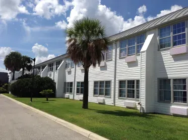 You can see the two levels of rooms as we walked around the left side of the hotel toward the Airport Diner that was located opposite the hotel right next to the runway, where we planned to have lunch. There is a photo with another view looking back from the runway showing the palm trees and water tower a little better.