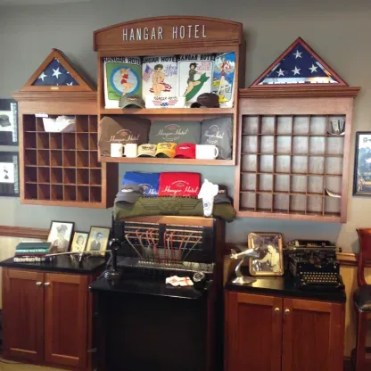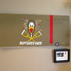 On the hotel lobby wall is an airplane panel with the The Ruptured Duck nose art painting of Donald Duck on crutches from the B-25B Mitchell medium bomber flown by Ted W. Lawson in the Doolittle Raid over Tokyo in World War II after the Japanese attack on Pearl Harbor in 1942. He piloted the 7th plane in the squadron and after the mission was completed he crashed in the China coast where he was critically injured and had his leg amputated to save his life.