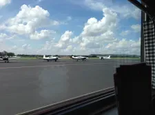 I captured these photos: hotel front desk, Ruptured Duck nose art on airplane panel, and a view of the runway from Airport Diner.